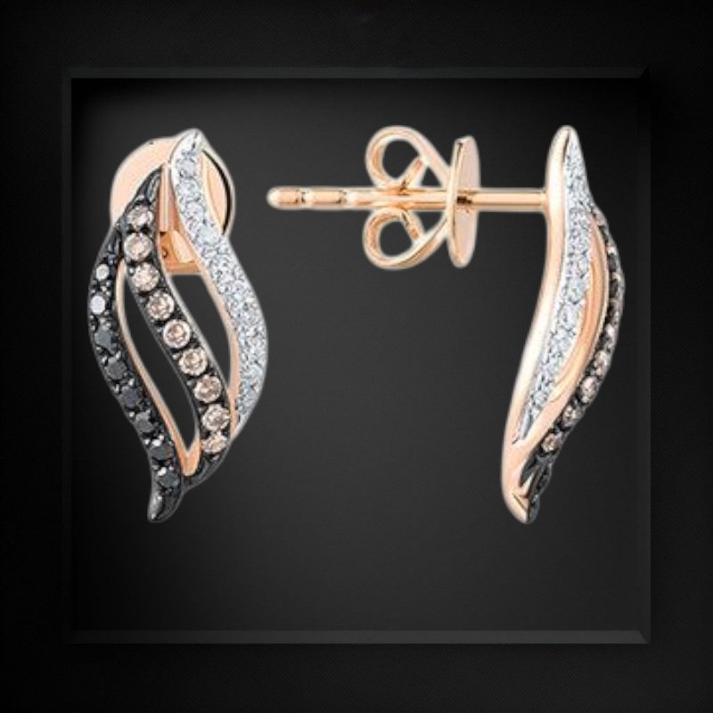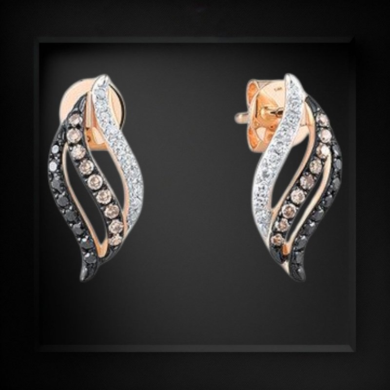 Make a bold and luxurious statement with these 14K rose gold diamond earrings, featuring a striking geometric wave design. The elegant curves are adorned with three stunning diamond types โ€” 0.05ct white diamonds, 0.07ct black diamonds, and 0.07ct brown diamonds โ€” creating a sophisticated contrast that sparkles from every angle.