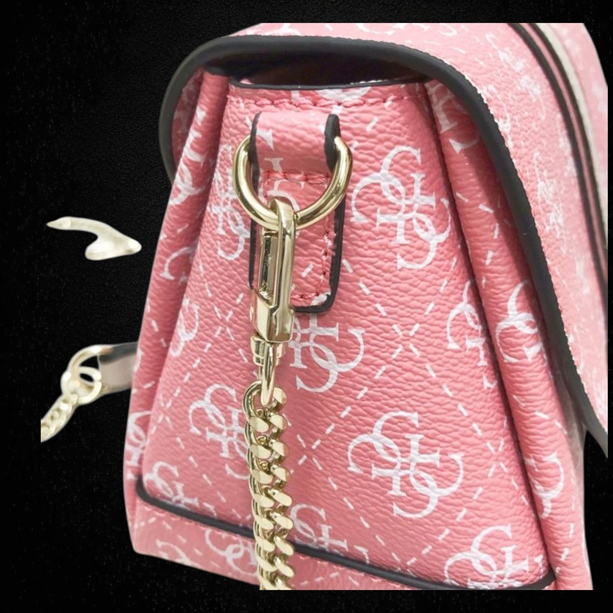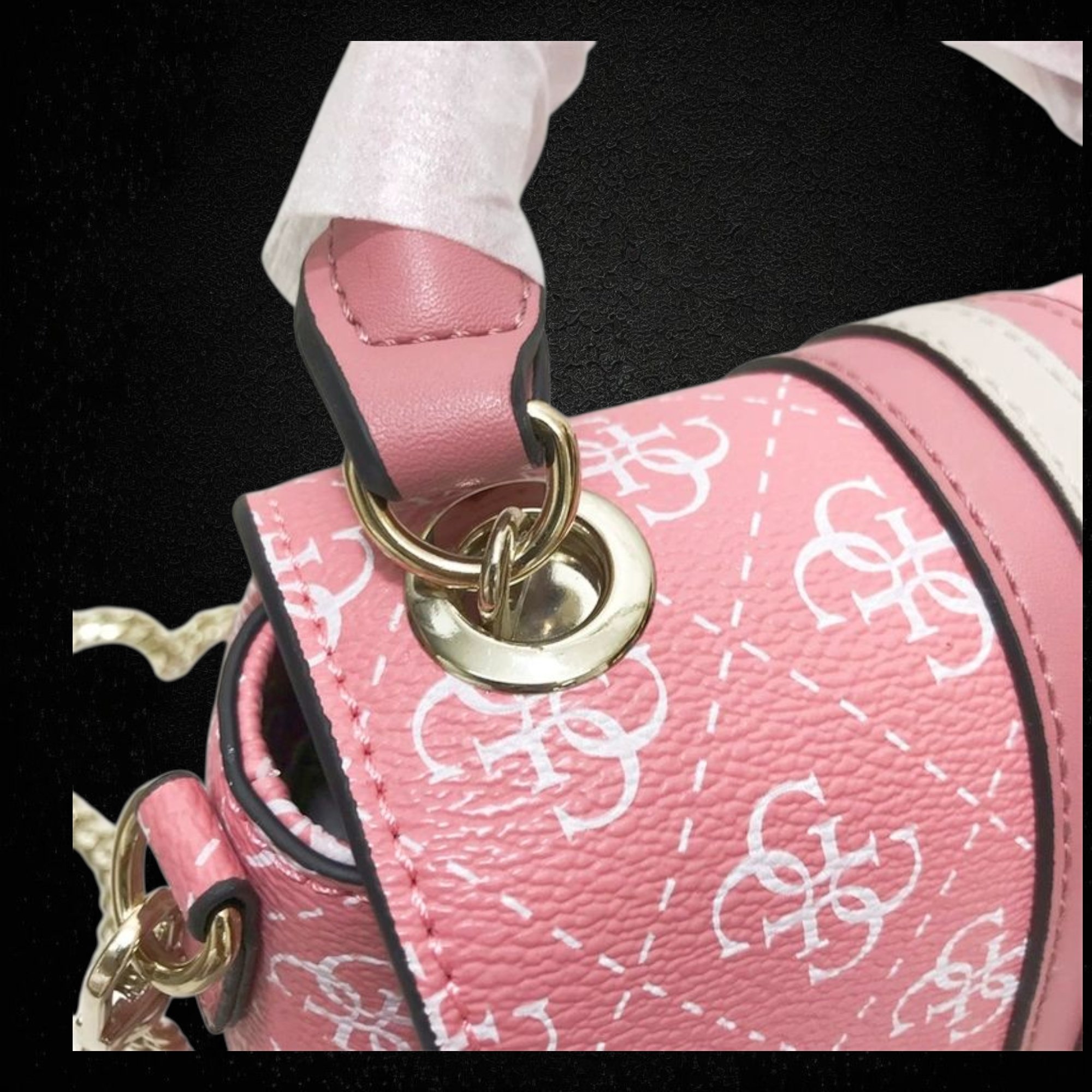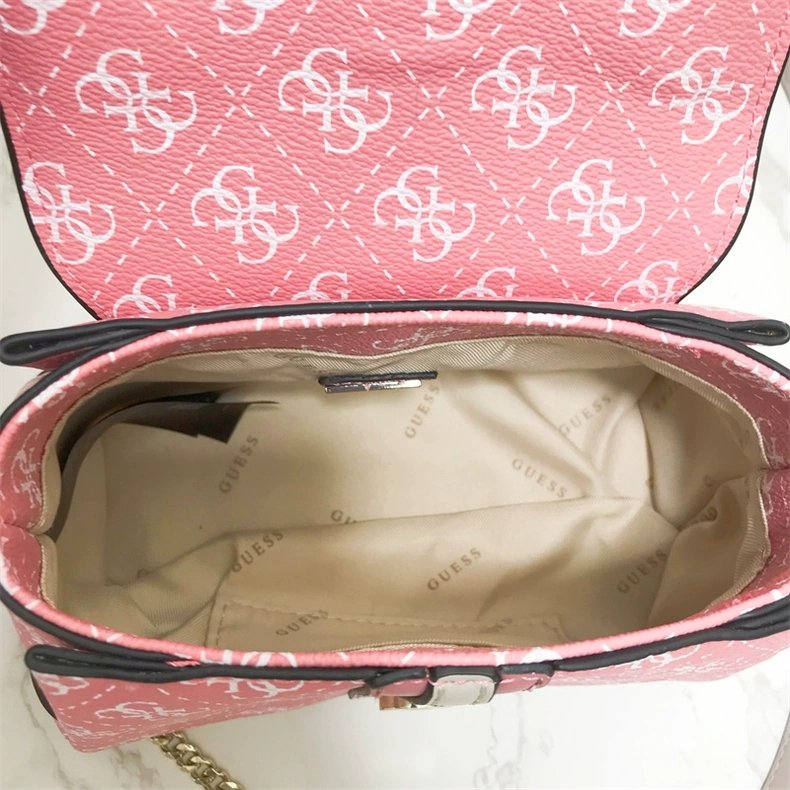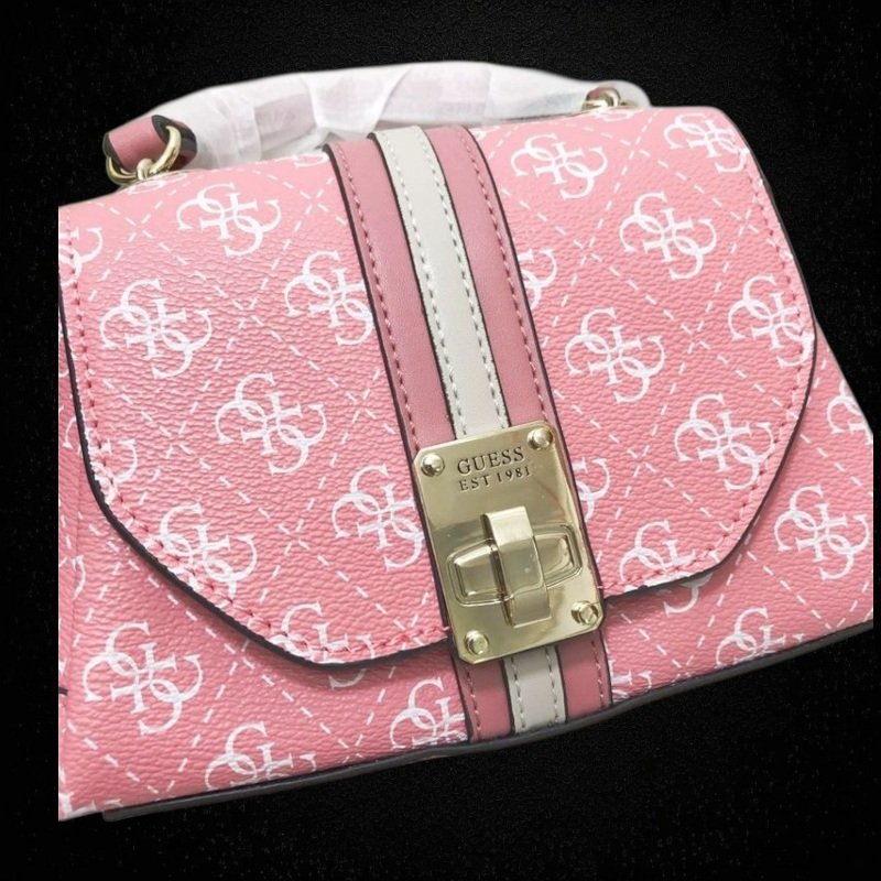 Chic pink Guess handbag crafted from premium PU leather with gold-tone hardware, detachable strap, and soft polyester-cotton lining.